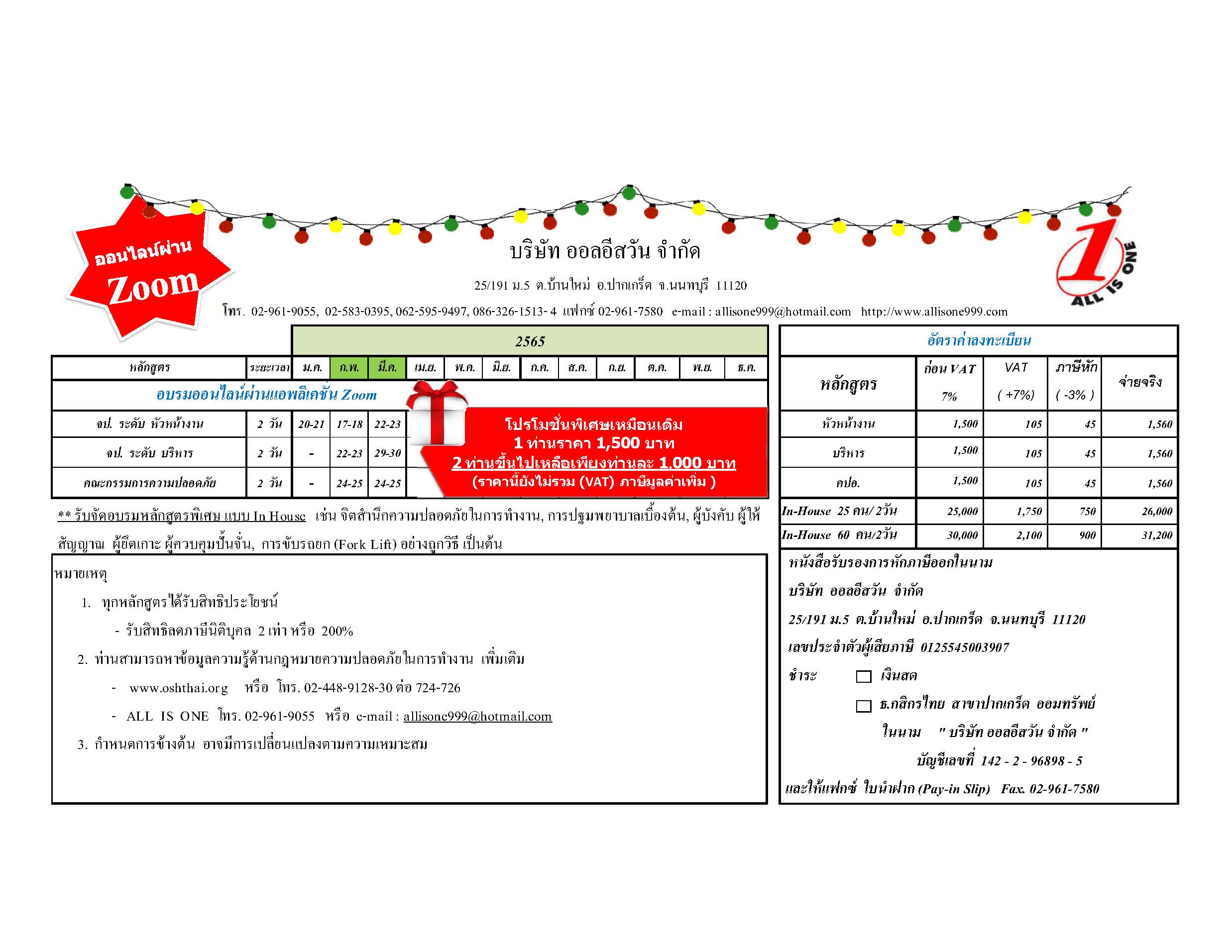 เช่นเคยค่ะ ออลอีสวัน ยังคงมอบโปรโมชั่นดีๆ ให้กับคุณลูกค้าเหมือนเดิมสำหรับการอบรมออนไลน์ผ่าน App Zoom ด้วยแผนการอบรมออนไลน์ประจำปี 2565 ท่านใดที่ยังไม่ได้อบรม จป. และ คปอ. ติดต่อเข้ามาได้เลยค่ะที่เบอร์โทร. 086-3261512-4 หรือ ทางอีเมล์ allisone999@hotmail.com ทางเรายินดีให้บริการค่ะดาวน์โหลด แผนการอบรมด้านความปลอดภัยในการทำงาน (จป. และ คปอ.) ประจำปี 2565