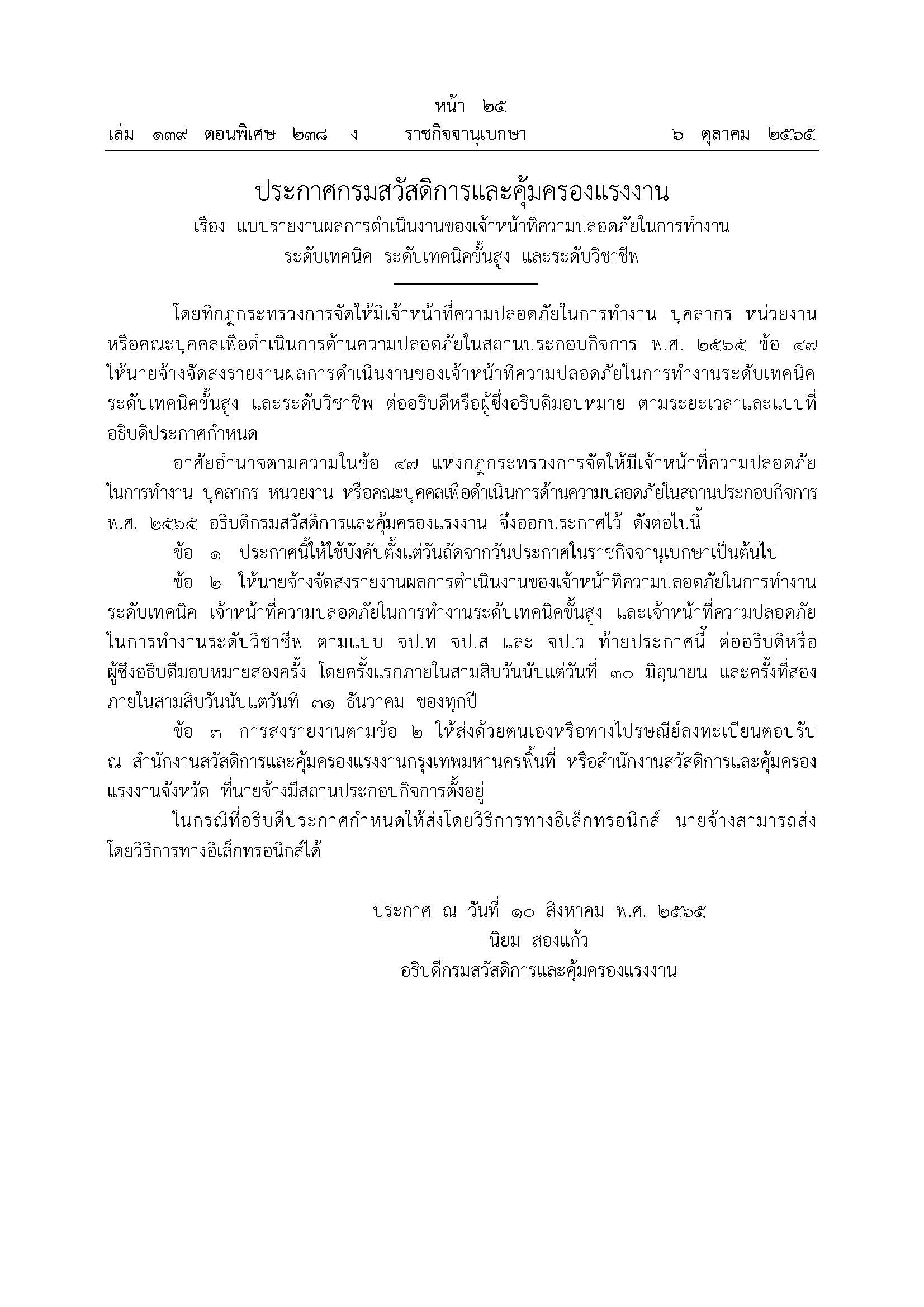 ประกาศกรมสวัสดิฯ เรื่อง แบบรายงานผลการดำเนินงานของเจ้าหน้าที่ความปลอดภัยในการทำงาน ระดับเทคนิค ระดับเทคนิคขั้นสูง และระดับวิชาชีพ