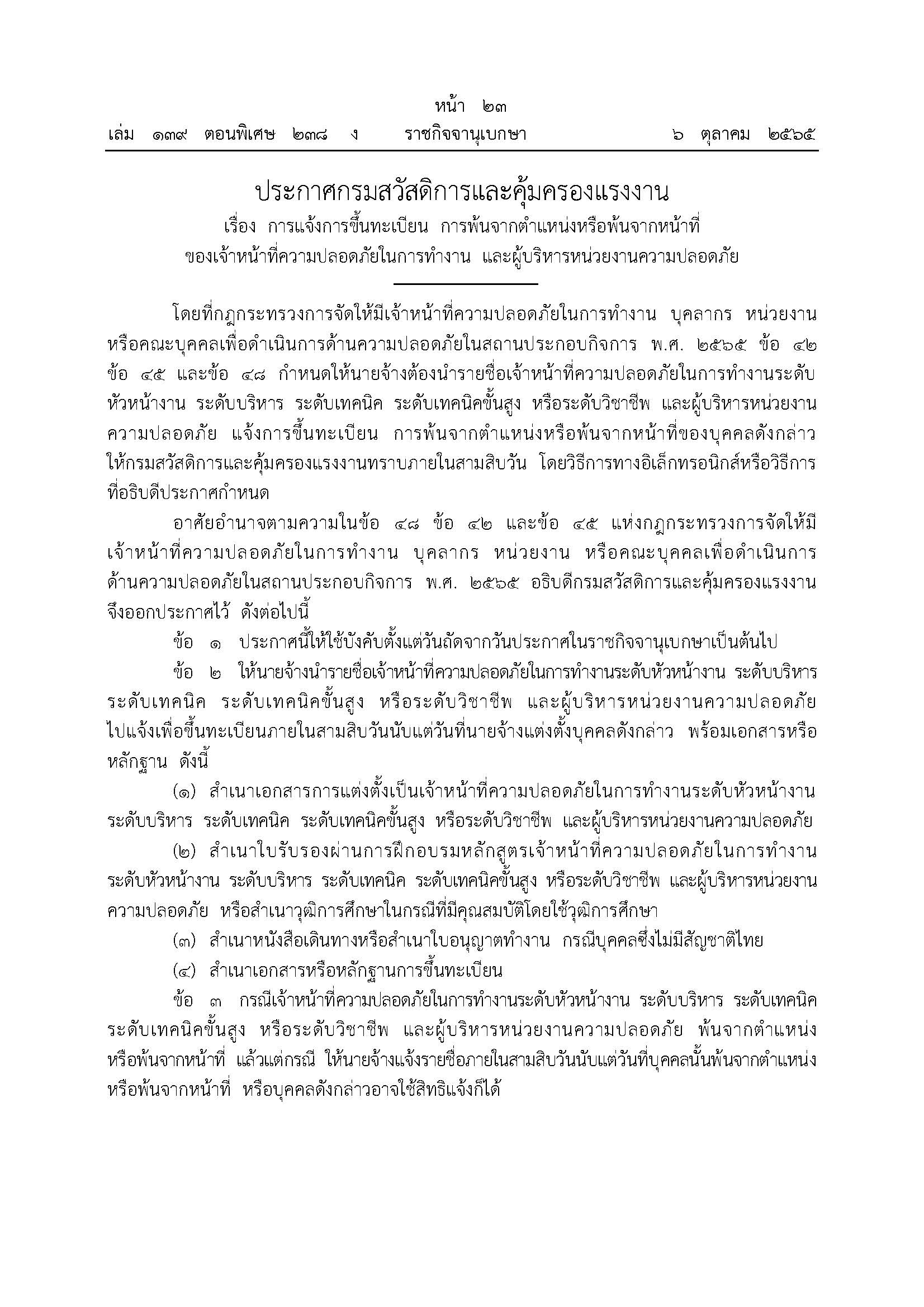 ประกาศกรมสวัสดิฯ เรื่อง การแจ้งการขึ้นทะเบียน การพ้นจากตำแหน่งหรือพ้นจากหน้าที่ของเจ้าหน้าที่ความปลอดภัยในการทำงาน และผู้บริหารหน่วยงานความปลอดภัย