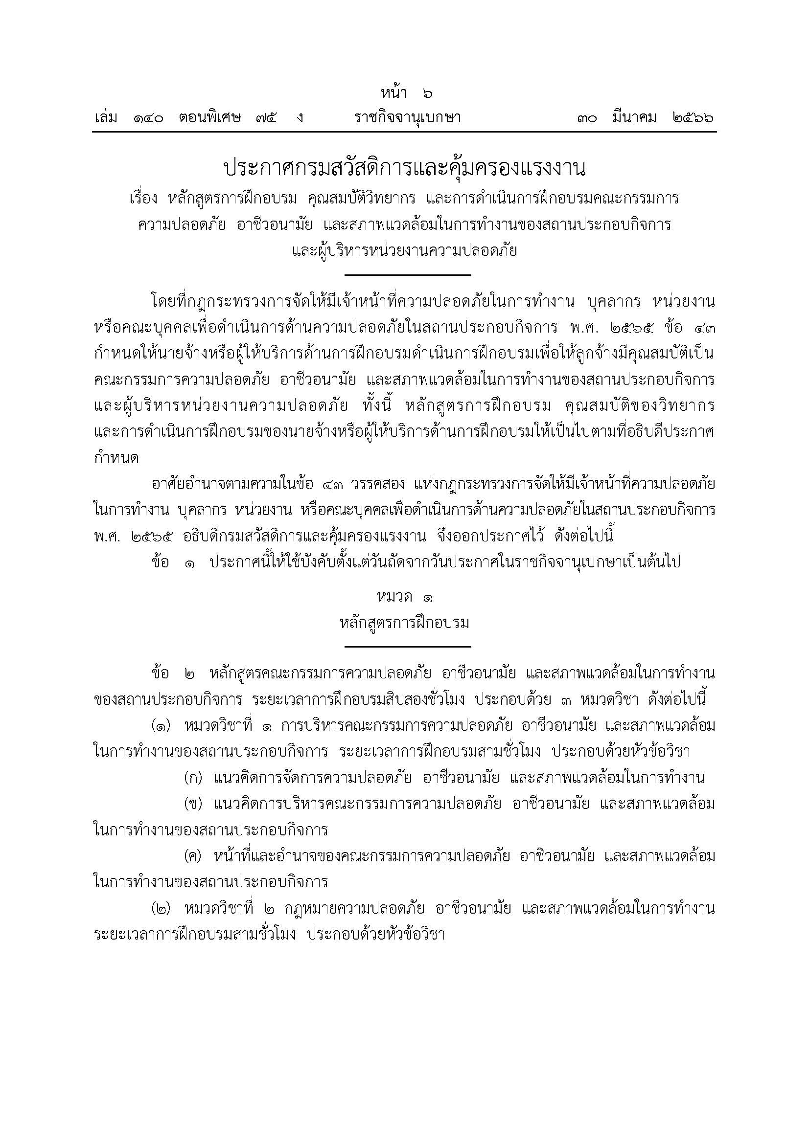 *NEW* ประกาศกรมสวัสดิ์ฯ เรื่อง หลักสูตรการฝึกอบรม คุณสมบัติวิทยากร และการดำเนินการฝึกอบรมคณะกรรมการความปลอดภัย อาชีวอนามัย และสภาพแวดล้อมในการทำงานของสถานประกอบกิจการ และผู้บริหารหน่วยงานความปลอดภัย