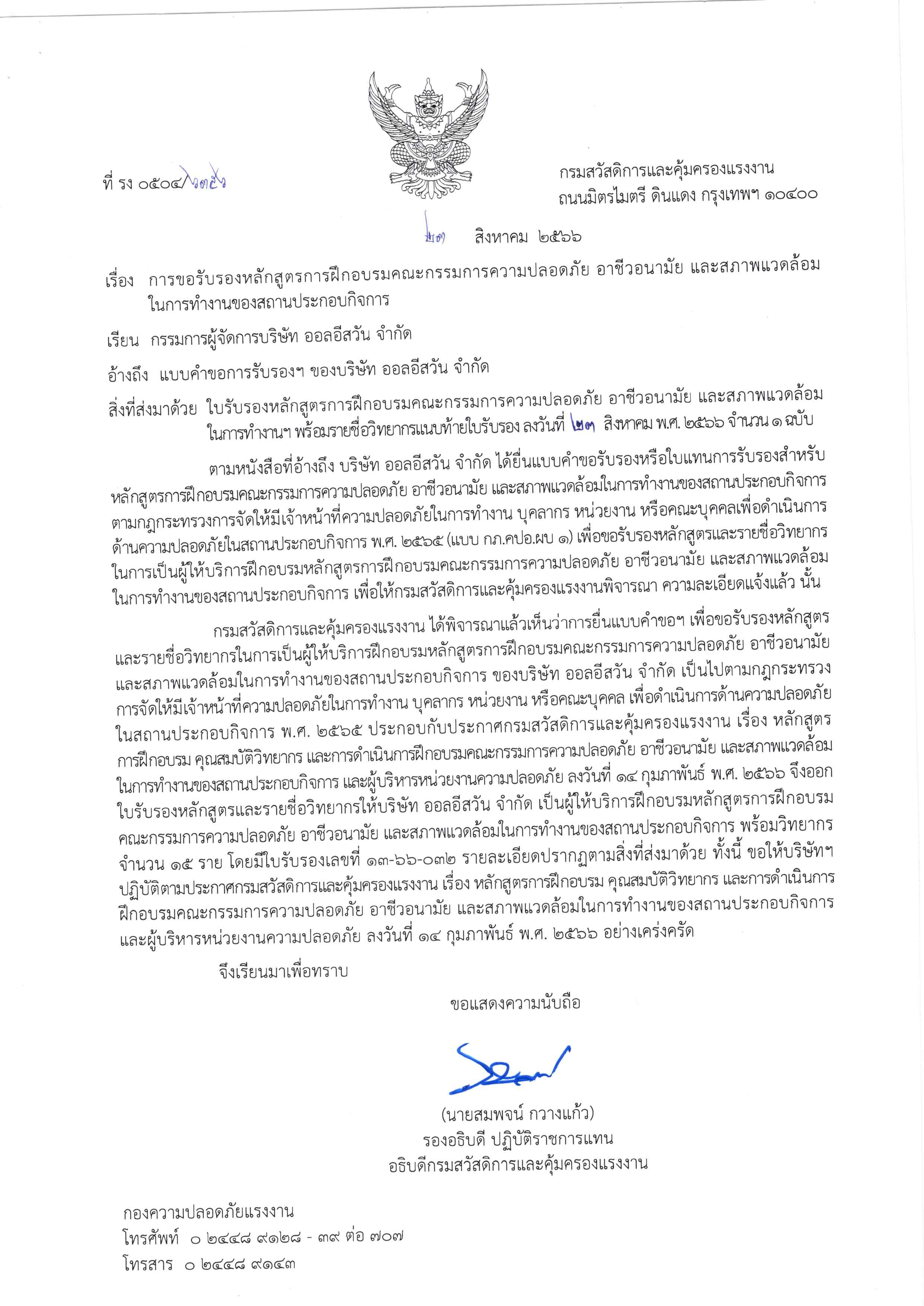 ได้รับการรับรองจากกรมสวัสดิการและคุ้มครองแรงงานในการเป็นผู้ให้บริการฝึกอบรม หลักสูตร คณะกรรมการความปลอดภัย อาชีวอนามัยและสภาพแวดล้อมในการทำงานของสถานประกอบกิจการ (คปอ.) ซึ่งเป็นไปตามกฎกระทรวงการจัดให้มีเจ้าหน้าที่ความปลอดภัยในการทำงาน บุคลากร หน่วยงาน หรือคณะบุคคล เพื่อดำเนินการด้านความปลอดภัยในสถานประกอบกิจการ พ.ศ.2565